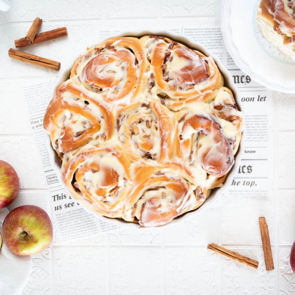 Apfel-Zimtschnecken sind, wenn man so will, die Weiterentwicklung der klassischen Zimtschnecke. Die Füllung mit Äpfeln ist besonders herbstlich und macht aus Deinen Hefeschnecken einen unvergleichlich saftigen Gaumenschmaus.