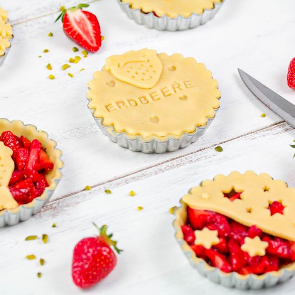 Verwende für die Deko der Erdbeer Tartelettes einfach die Ausstecher, die Du im Haus habst und tobe Dich kreativ aus. Einfache Streifen aus Mürbeteig sehen übrigens auch sehr schön aus, wenn sie übereinander geflochten werden.