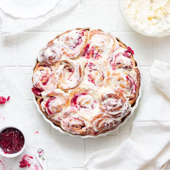 Der fluffige Hefeteig mit der fruchtigen Füllung und dem süß-salzigen Frosting ergibt eine ausgewogene Komposition, die Du lieben wirst. Übrigens: Wenn Du keine Kerne magst, rate ich Dir die gefrorenen Himbeeren wegzulassen und zu einer Himbeermarmelade ohne Kerne zu greifen.