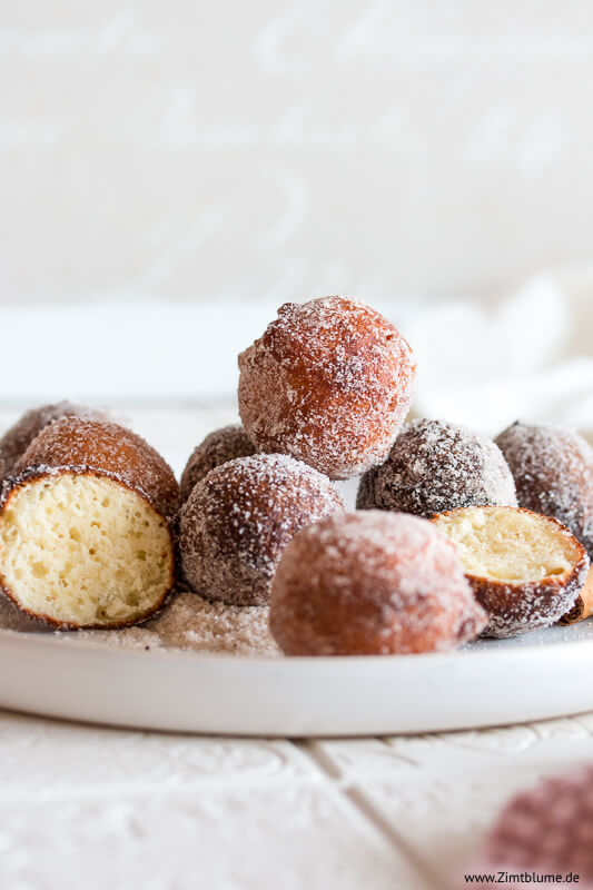 - Die Quarkbällchen auf Küchenkrepp legen und anschließend in Zimtzucker wälzen