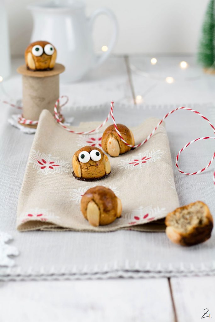 - Die abgekühlten Bethmännchen lassen sich nach Wunsch verzieren. Für die Eulen etwas Schokolade schmelzen und jeweils zwei Zuckeraugen aufkleben