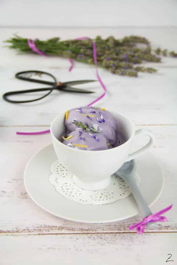 Eine Sache noch: Die schöne lila Farbe ist absolut nicht natürlich. Sorry. Wenn Du Lavendel in Sahne aufkochst, erhältst Du – wenn überhaupt – eine ganz leicht violettfarbene Tönung. Ich habe mit Lebensmittelfarbe nachgeholfen. Auch Eisdielen greifen zu diesem Trick.