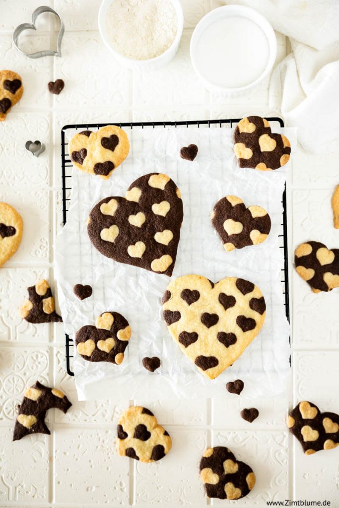 Eigentlich besteht dieses Rezept zu einem Drittel aus backen und zu zwei Dritteln aus puzzeln.😁 Du musst nämlich zuerst kleine Herzchen aus dem hellen Mürbeteig auszustechen und sie dann vorsichtig in die Lücken des dunklen Mürbeteigs drücken. Und umgekehrt. Eine tolle Beschäftigung für verregnete Sonntage, würde ich sagen.