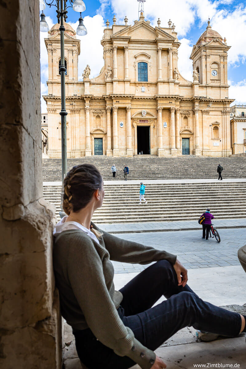 So wenig mir der Vibe in Syrakus gefallen hat – das etwa 35 Kilometer entfernte Noto ist wunderschön. Und irgendwie entspannter. Hin und wieder schiebt sich eine Reisegruppe mit Reiseführer:in durch die Gassen. Ansonsten hast Du Noto in der Vorsaison für Dich.