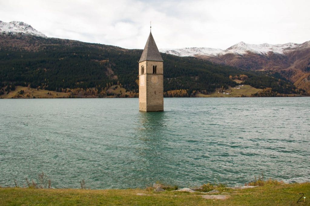 Auf dem Weg von Freiburg nach Meran geht es über den Reschenpass. Schnee lag nicht. Allerdings wehte eine wirklich steife Brise. Brrr! Die Kirche mitten im Reschensee musste trotzdem fotografiert werden. Es sieht einfach zu schön aus, wie der Kirchturm, als einzig sichtbares Zeichen des überfluteten Dorfs Graun aus dem See ragt.