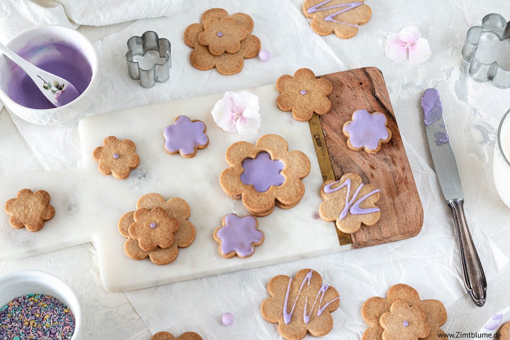 Die Glasur für diese Kekse sieht je nach Jahreszeit ein bisschen anders aus. Im Frühjahr sorgt fliederfarbene Glasur für gute Laune. Sie geht ganz einfach. Du benötigst nur 3 Zutaten: